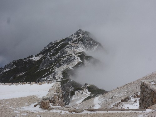 燕山荘回りからは見ることは出来ないのですが、山頂や三角点付近からなら見ることが出来ます。こちらから見るときれいな三角形をしています。これを剣岳と間違える方もいらっしゃいます。