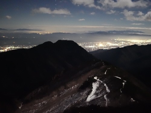残念ながら、雲を通しての月明かりとなりましたが、明るい月が雪で白くなった部分を照らしだして、ヘッドランプなしでも歩けるほどでした。そして、21時頃、東の空を見ればオリオン座が上り始めたところでした。