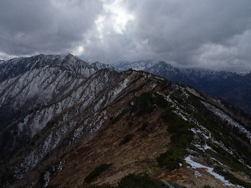 小屋の前から見る合戦尾根には雪がたくさんあるように見えますが、合戦尾根の反対側を見るとこちら側には雪はほとんどありません。