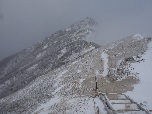 朝、ほんの少しの間だけ強風でガスが取れて、燕岳が見えました。