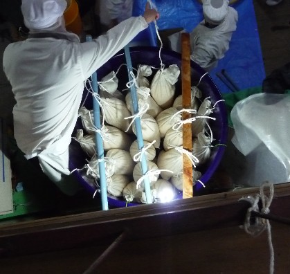 袋吊りによる上槽で、酒袋にもろみを詰めて吊るし、自然に滴り落ちるお酒を採る方法です。
