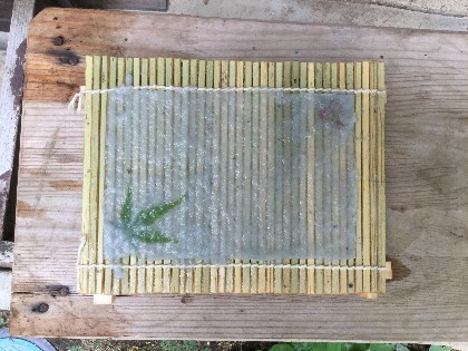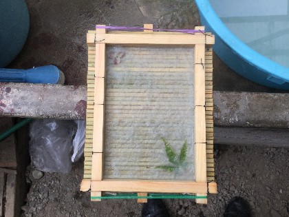 この、道具を使って溶かした新聞紙から再生紙を作ります。