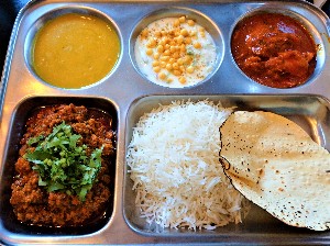 奥さまのオーダーはタリー。これは、北インドの定食で、専用の食器にチキンカレー、豆カレー、ライタ(ヨーグルトサラダ)、ごはん、パパド(豆の粉のせんべい)、菓子またはアチャール(インドの漬け物)がセット(1400円)になっています。そして、今回もご飯をジャポニカ種からインディカ米であるバスマティス米に変更(+100円)。