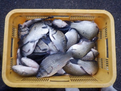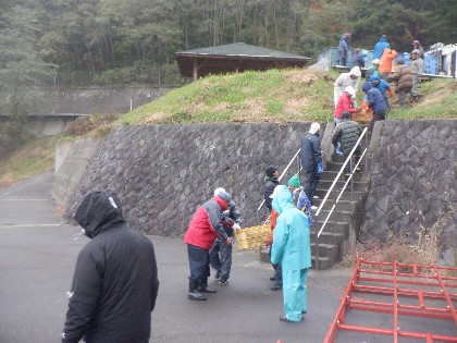 今日の美鈴湖は、朝の7時30分くらいから小雨が降る中、へら鮒の放流が30人のボランティアの方々で行われました。