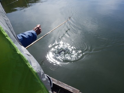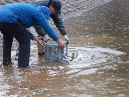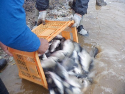 〈へら鮒放流の様子〉