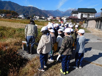 今年も残すところ2か月を切り、北アルプスも白く雪化粧をし始めた11月7日(月)、大町西小4年生の水路学習に協力しました。 学習内容は、大町西小学校の校庭を流れる水はどこから来るのか、小学校から取水口の猫鼻までを辿るというものでした。 今回の学習を通して、子ども達が地域の歴史や水路について興味を持ち、そして農業用水という形で自分たちの生活とも繋がっていると感じ考えるきっかけになるよう、今後も学習協力をしていきたいと思います。 |