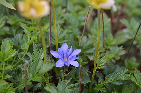 残雪が融けてハクサンイチゲの白とシナノキンバイの黄色がジグザグ路一面に明るいモザイク模様をかたち作る頃、その他の花たちも、控えめに、あるいは、強く主張して、百花繚乱の様相を呈しています。