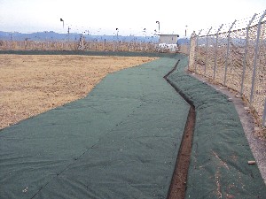 施主の子供が元気なので張った芝を剥がそうとしないように砂を多めに撒きました