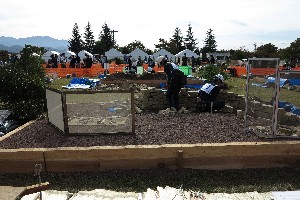 石積みの後は残りの課題のレンガ敷きやベンチ等をやり、1日目は終了です。