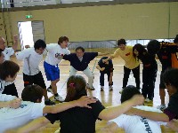 もちろんプログラムはもちろん参加者全員での「SOコール~ハイタッチ」からはじまります。 体がかたい人もやわらかい人もしっかりストレッチを行ないます。 休息時間には汗を拭いたり水分補給したり、そしてパートナーとさまざまな交流が行われます。 みなさんお疲れ様でした! ゼミ生の皆さんは レポート作成も きちんと行っておきましょう。